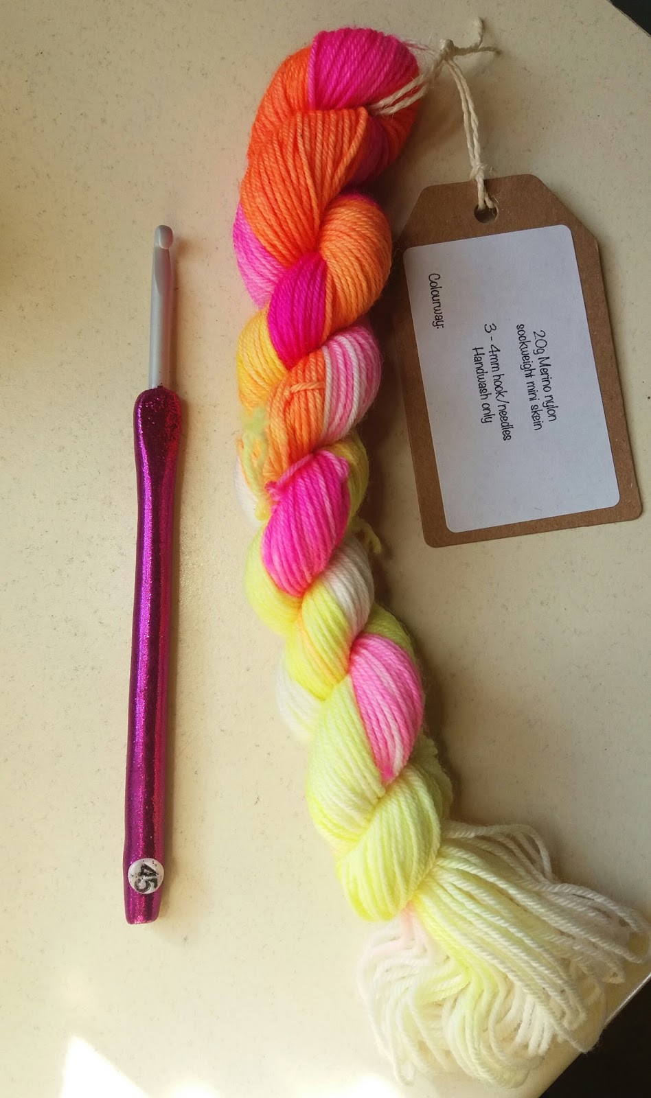 The only thing that came through my doors were this hook and mini from as part of their Crochet Hook Club. The box included a handmade crochet hook along with a complimentary skein of yarn and a pattern for a crocheted mitred square. I went with the mini skein (20g sock weight) but you can also choose full-size skeins.